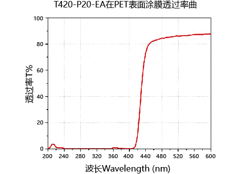 实例列举:T420-P20-EA:稀释剂:胶水(40%固含)=0.5:4:4(重量比)混合均匀,涂布干膜厚度8~10μm,200~420nm阻隔率达99%以上。